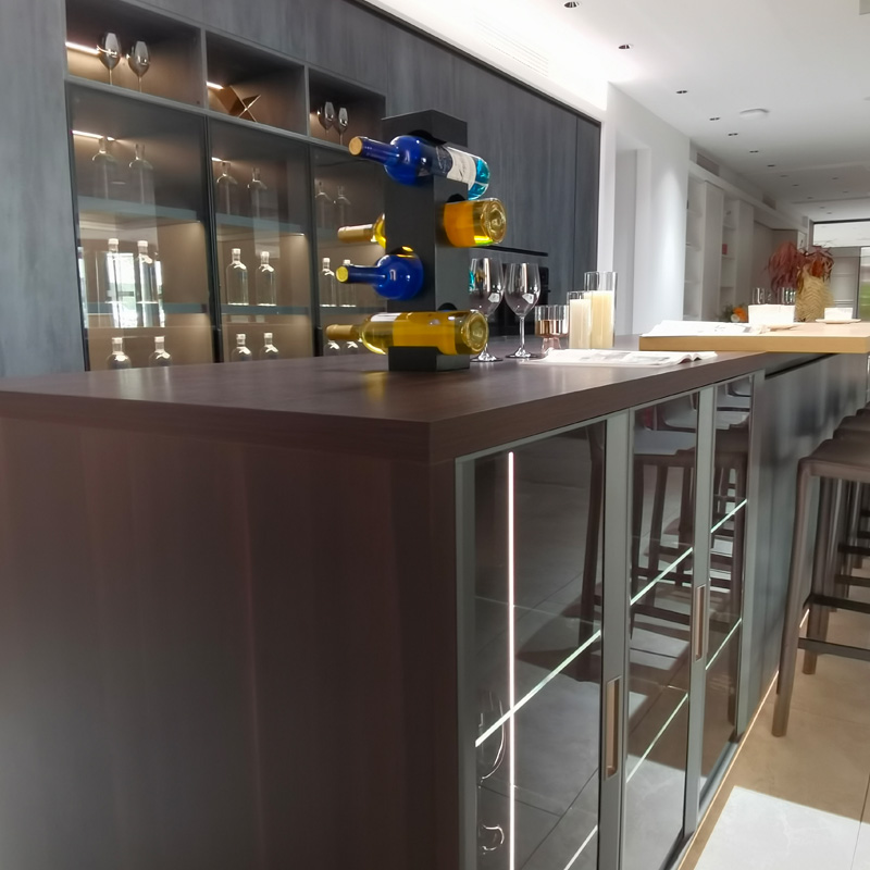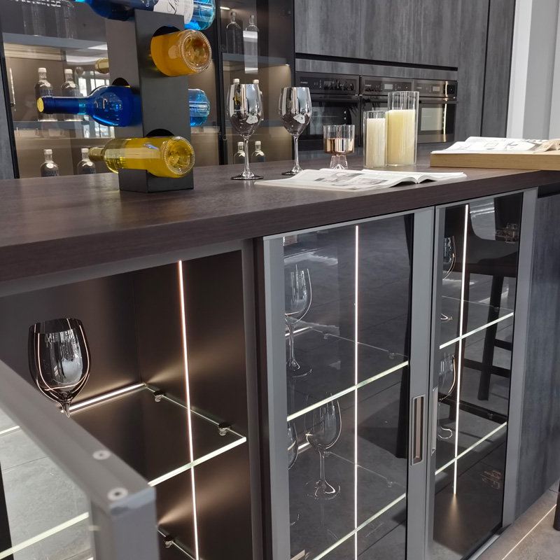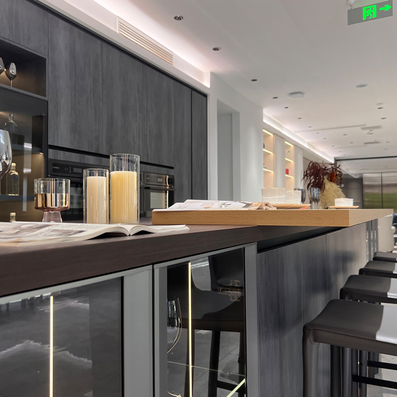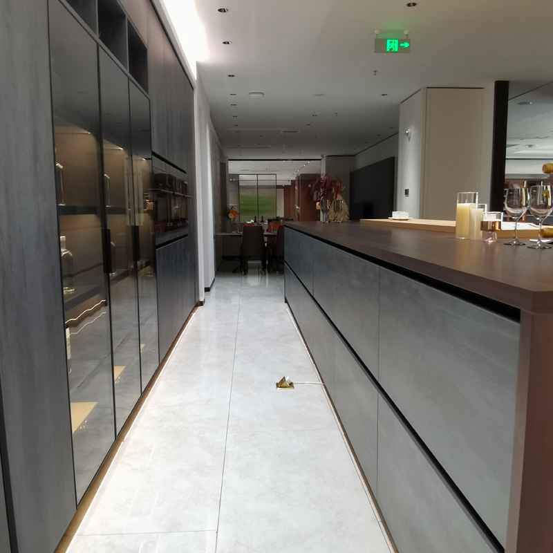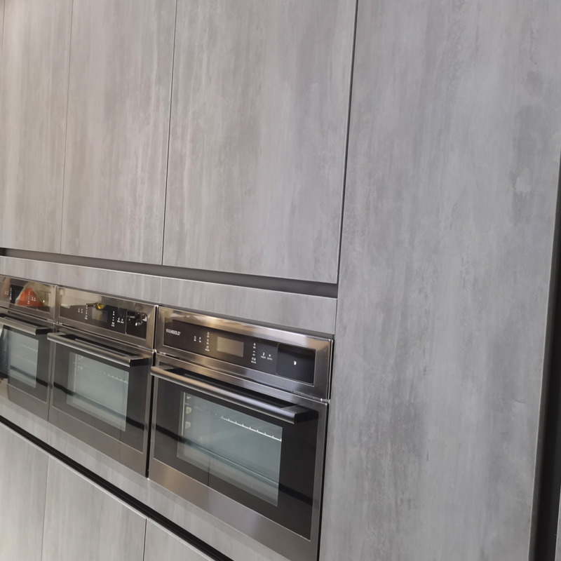 Tủ bếp nhiều lớp kiểu mới với cách xử lý màu cũ như đá phong hóa, cảm giác sờ vào mượt mà và chất lượng, phù hợp với cửa kính khung nhôm, tạo hiệu ứng trang trí nhà bếp cao cấp. Chất liệu không thấm nước, dễ lau chùi và không dễ bị bong ra.