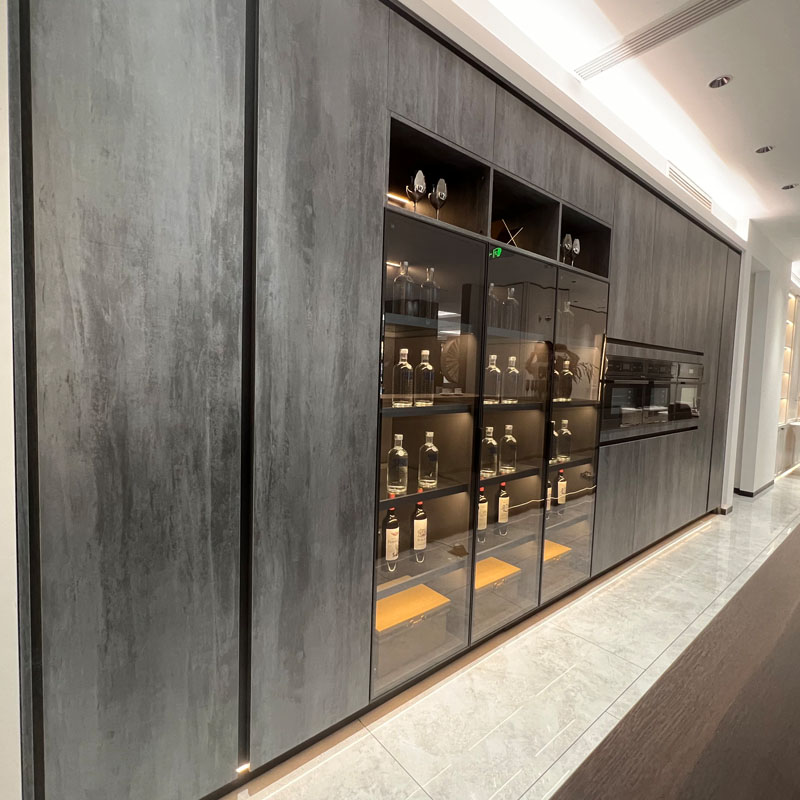 Tủ bếp ép gỗ công nghiệp kiểu mới thời trang với cách xử lý màu sắc cũ kỹ như đá phong hóa, cảm giác sờ vào mượt mà và chất lượng, phù hợp với cửa kính khung nhôm, tạo hiệu ứng trang trí nhà bếp cao. Chất liệu không thấm nước, dễ lau chùi và không dễ bị bong ra.