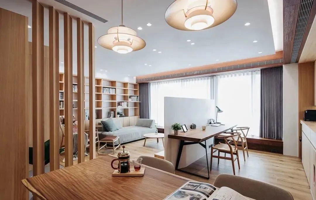 Tủ sách sofa tường:Cài đặt một tủ sách trên bức tường nền sofa phòng khách, với thiết kế tích hợp tiết kiệm nhiều không gian hơn. Ghép nó với một đèn sàn, và bạn có thể ngồi trên ghế sofa và đọc.