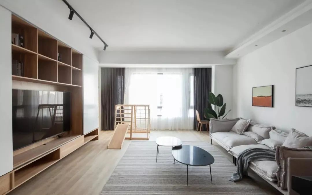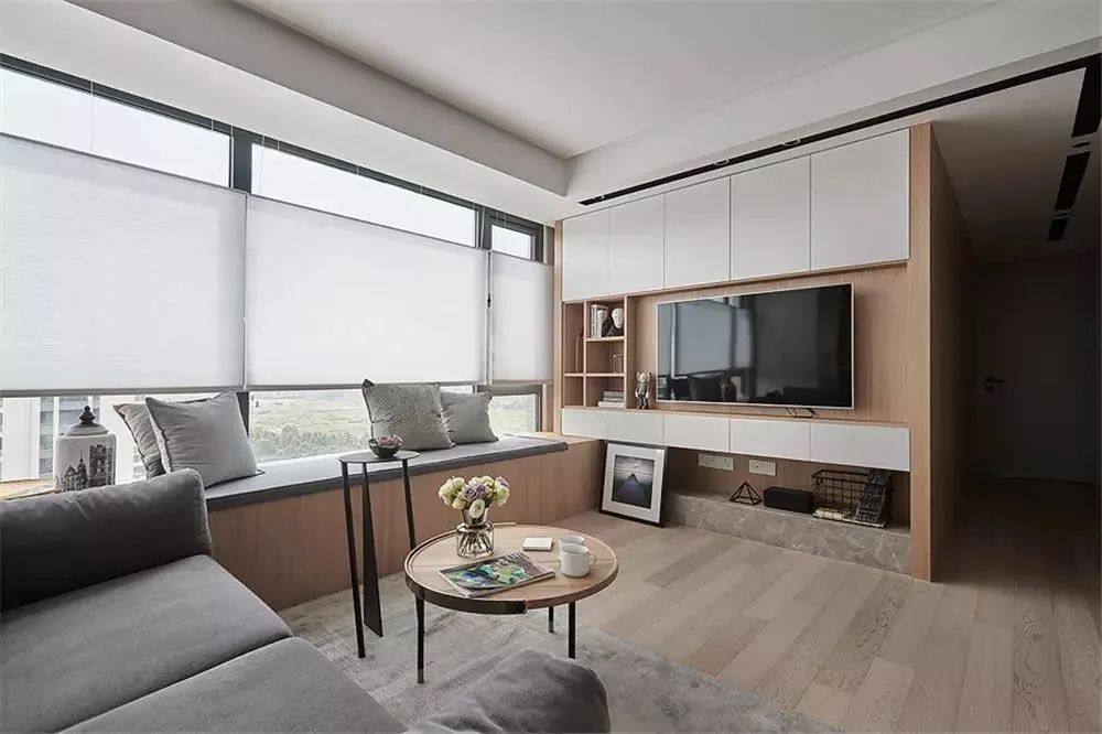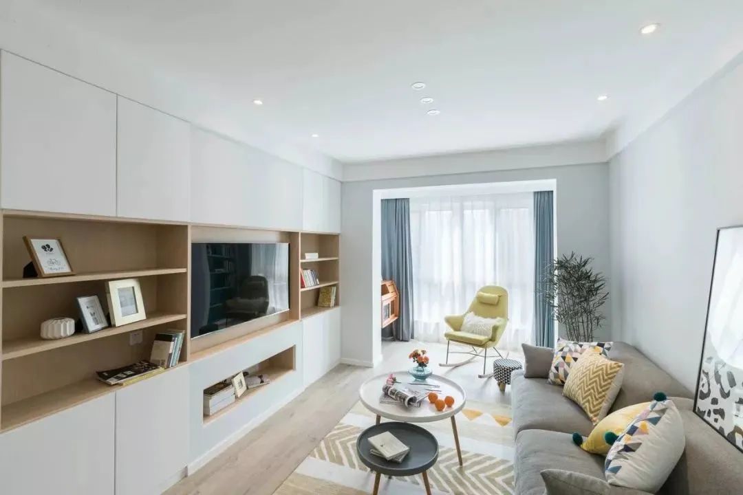 Tủ sách trên TV:Tùy chỉnh toàn bộ bức tường của tủ lưu trữ trong phòng khách, kết hợp tủ TV với tủ sách cho thiết kế hai trong một.
