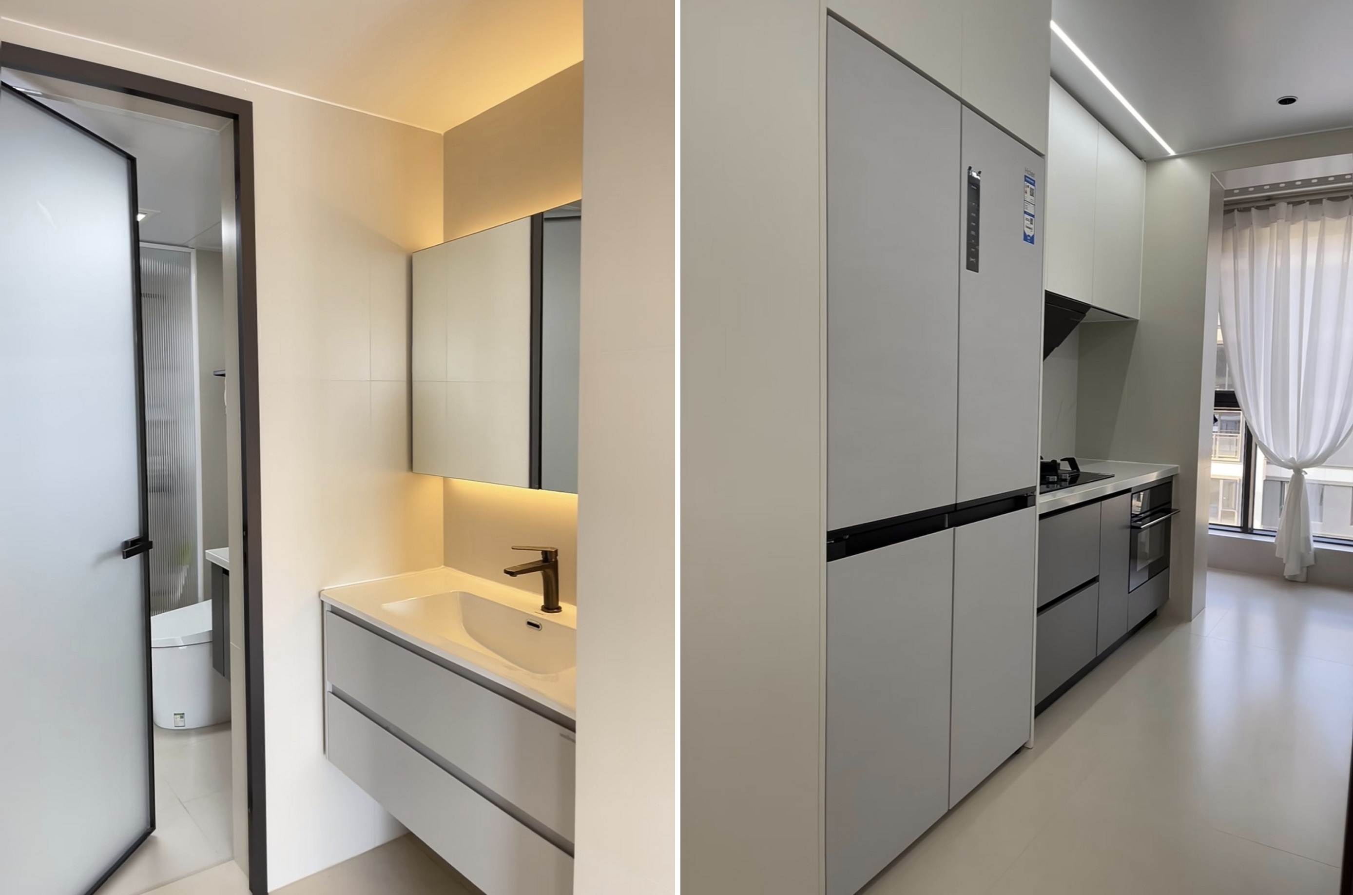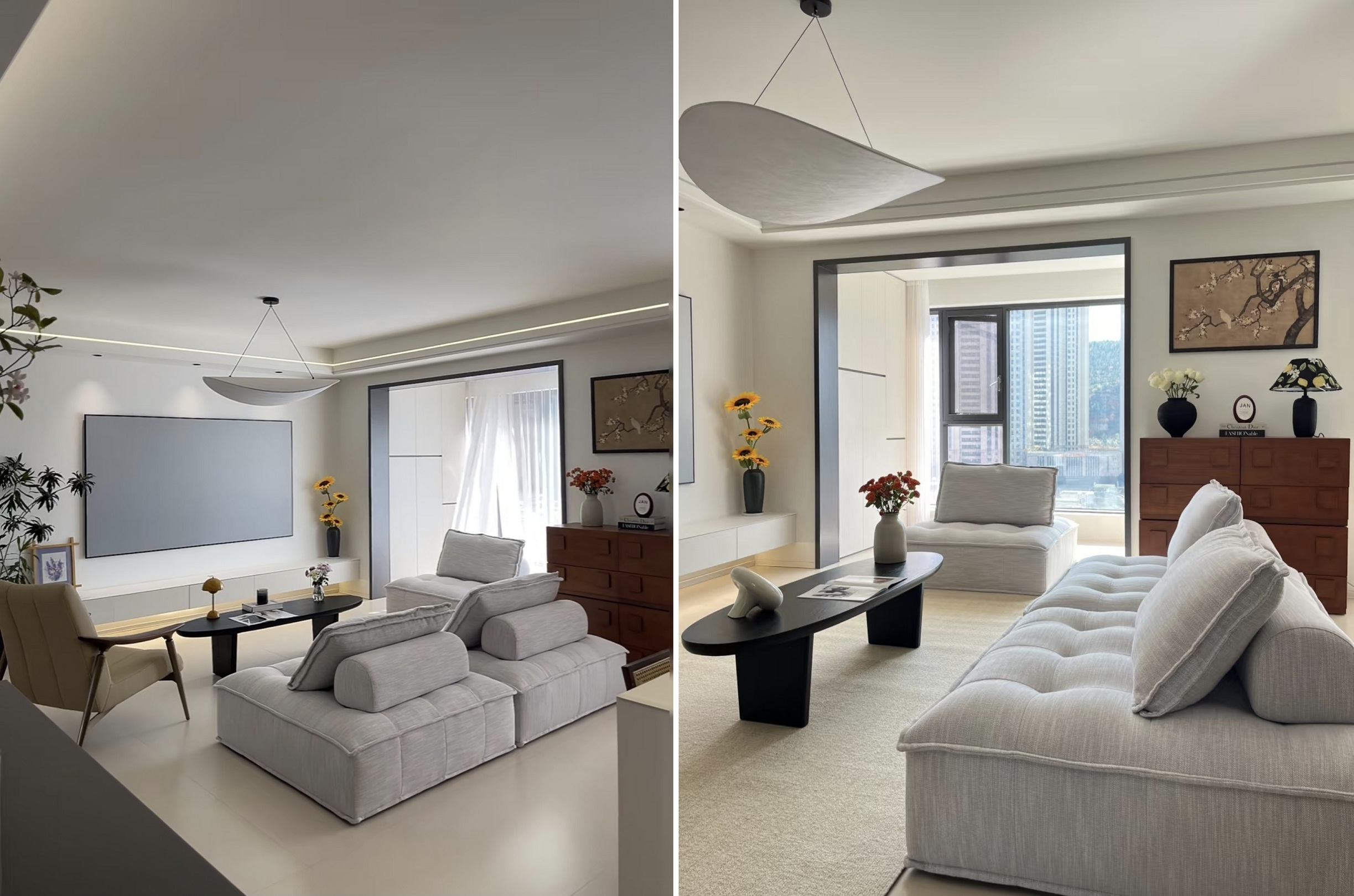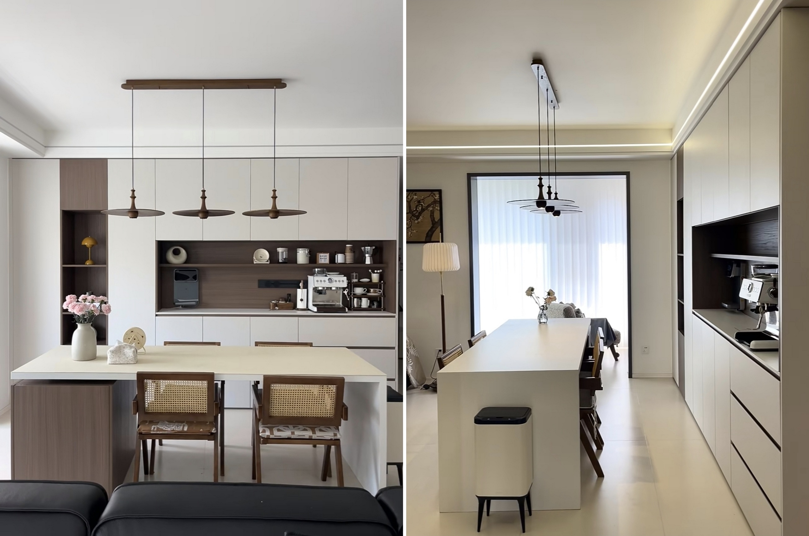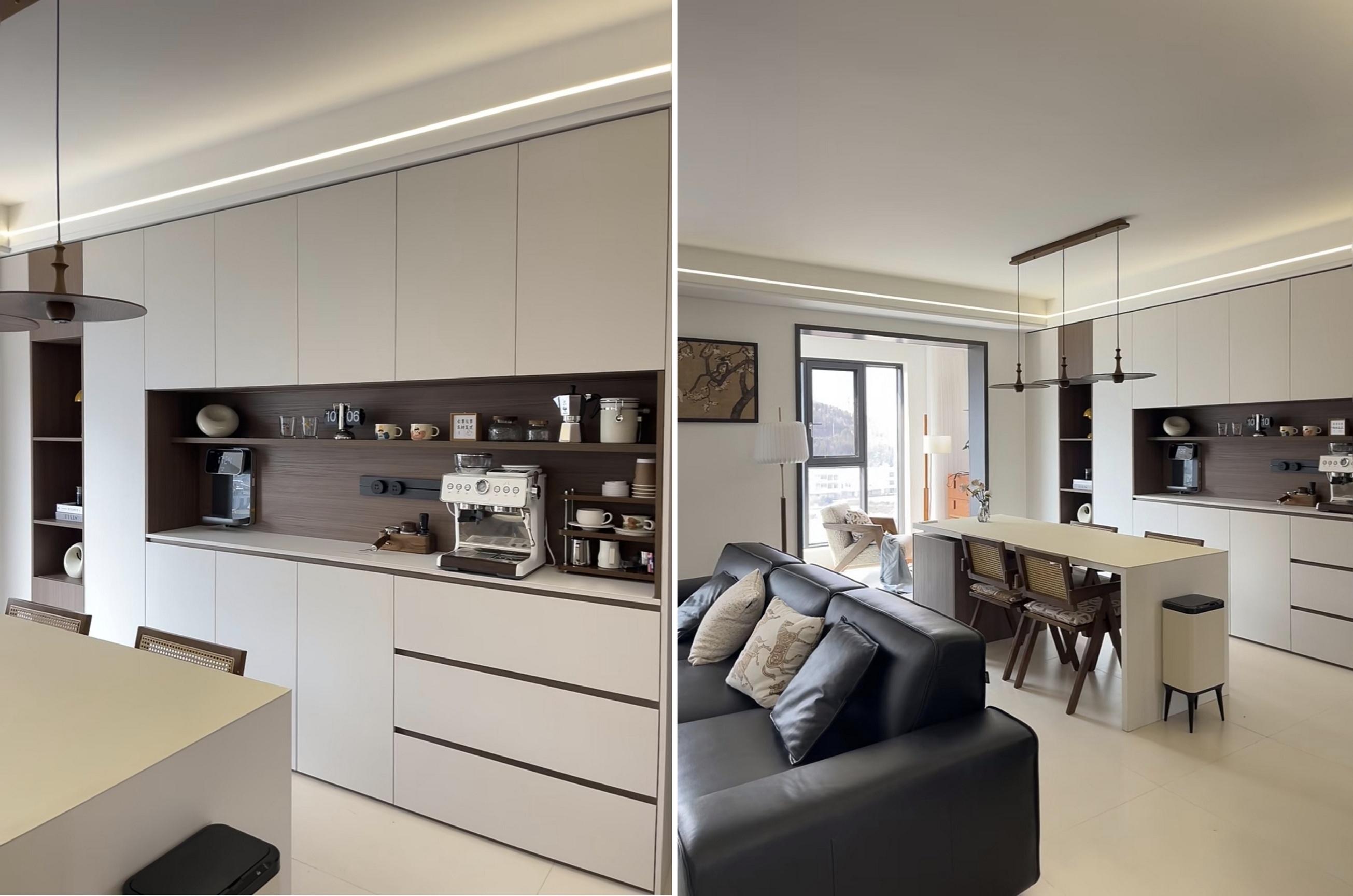 Không có thiết kế trần phức tạp; Thay vào đó, một phong cách đôi mắt đôi đơn giản được áp dụng, với đèn tuyến tính được nhúng để tăng cường môi trường. Điều này không chỉ cung cấp ánh sáng rộng rãi mà còn tạo ra một hiệu ứng ánh sáng ấm cúng và lãng mạn vào ban đêm, thêm chiều sâu mà không cần thu thập bụi dễ dàng.
