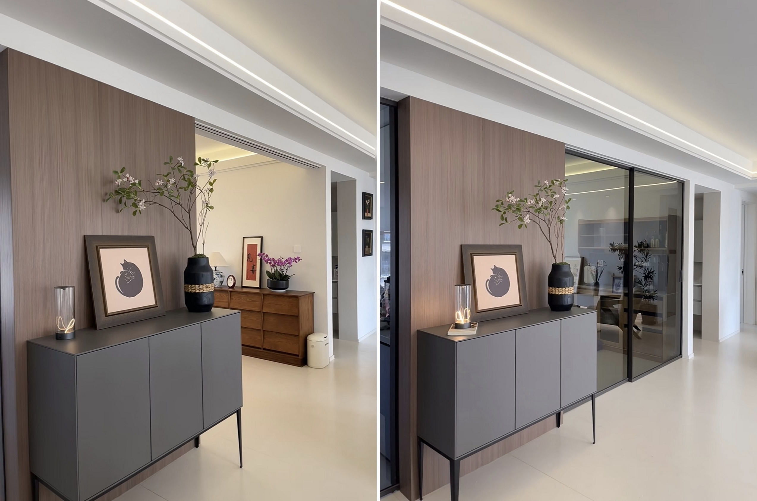 Cánh cửa trượt vào ban công và một bức tường phòng ngủ đã được gỡ bỏ. Phòng ngủ bị phá hủy đã được chuyển thành một nghiên cứu, với một cánh cửa bỏ túi được thiết kế để che giấu cánh cửa khi mở, tạo ra một nghiên cứu kế hoạch mở và cung cấp một không gian riêng tư khi đóng, mang lại sự linh hoạt và linh hoạt.